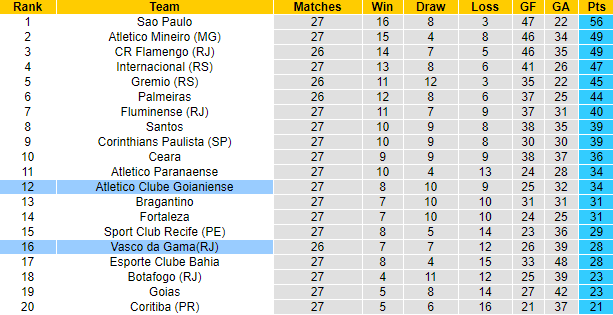 Hiện tại Vasco da Gama cũng không còn vướng bận Cúp châu lục sau khi bị loại ở vòng 1/8 Copa Sudamericana. Lực lượng đội khách cũng trở lại với trạng thái tốt, động lực thi đấu lớn với cuộc đua trụ hạng ở giai đoạn cuối mùa. Bên kia chiến tuyến, Atletico GO lại không tạo được sự tin tưởng trên sân nhà, 7 trận tiếp khách gần đây họ để mất điểm 6 lần (thua 3, hòa 3).
