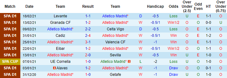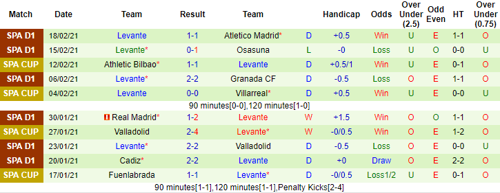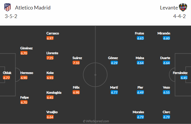 Trên sân khách Levante bất bại 6 trận liên tiếp gần đây tính trên mọi đấu trường. Trận đối đầu Atletico Madrid ở giai đoạn lượt đi diễn ra hôm 18/2 vừa qua, Levante cầm hòa đối thủ với tỷ số 1-1. Atletico Madrid vắng 6 trụ cột ở trận đấu sắp tới vì án treo giò và Covid-19, Atletico Madrid rất khó thi đấu khởi sắc trong tương lai gần.