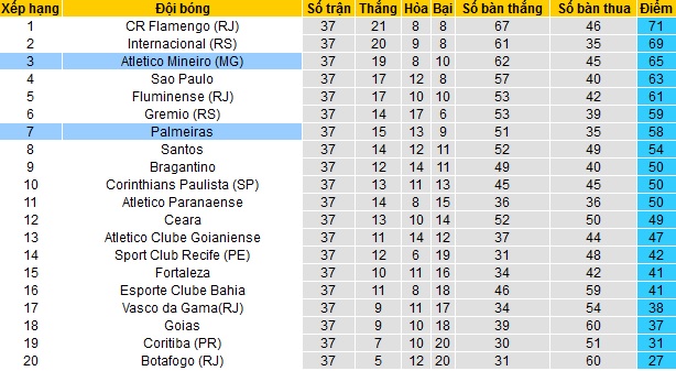 Bảng xếp hạng giải VĐQG Brazil trước vòng 38