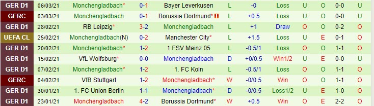 + Thống kê 10 trận gần nhất của M'gladbach