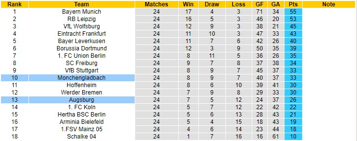 Theo đó, Augsburg giành được 1 trận thắng, hòa 1 và thua 1 lần ở 3 lượt trận đã đá trong một tháng vừa rồi tại giải VĐQG Đức. Với phong độ hiện tại và thêm lợi thế được chơi trên sân nhà, Augsburg tự tin hướng tới một kết quả suôn sẻ ở trận đấu sớm nhất vòng 25 giải VĐQG Đức.