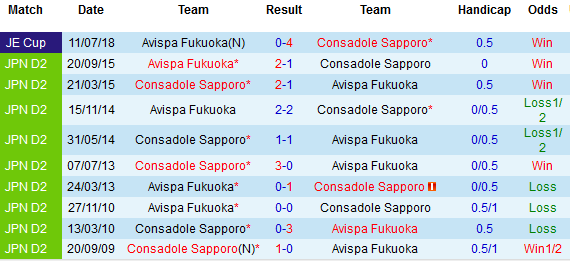 + Lịch sử đối đầu Avispa Fukuoka vs Consadole Sapporo