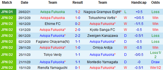 + Thống kê 10 trận gần nhất của Avispa Fukuoka