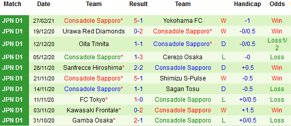 + Thống kê 10 trận gần nhất của Consadole Sapporo