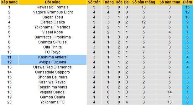 Trong khi đó Kashima Antlers ở mùa giải trước cũng chỉ cán đích ở vị trí thứ năm. Hiện tại đội bóng đang đứng ngay trên đối thủ ở vị trí thứ 11 cũng với 4 điểm nhưng mới thi đấu 3 trận.
