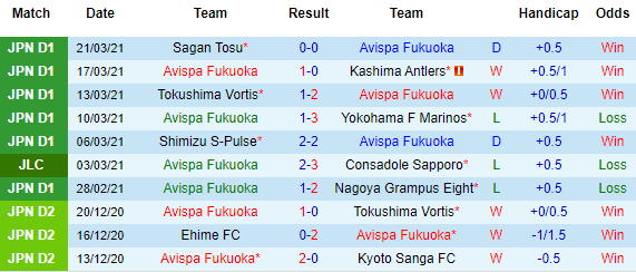 + Thống kê 10 trận gần nhất của Avispa Fukuoka