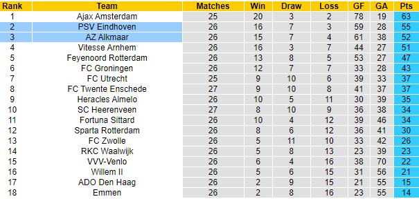 Nên biết rằng đội xếp thứ 2 sẽ có suất dự vòng sơ loại Champions League, còn kẻ xếp thứ 3 thì chỉ được tham dự Europa League mà thôi. Trận cầu ngày hôm nay vì thế rất quan trọng với đôi bên, đặc biệt là AZ Alkmaar bởi nếu thua họ gần như sẽ không thể bắt kịp đối phương mà thậm chí có thể bị Vitesse qua mặt.