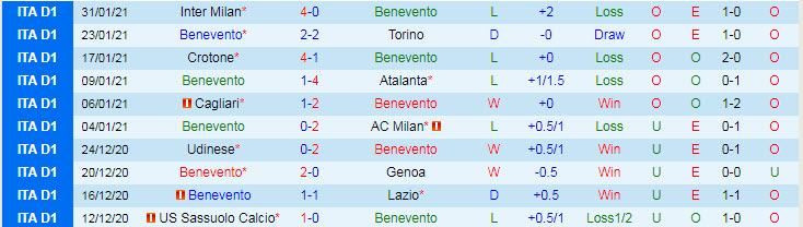 + Thống kê 10 trận gần nhất của Benevento