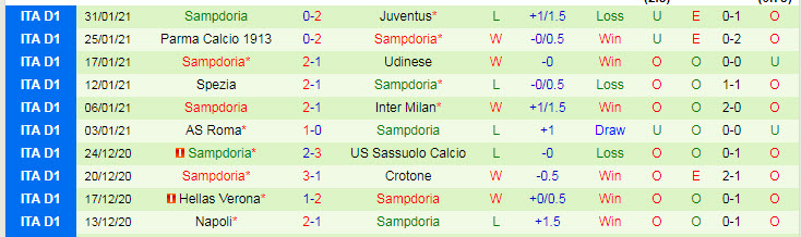 + Thống kê 10 trận gần nhất của Sampdoria