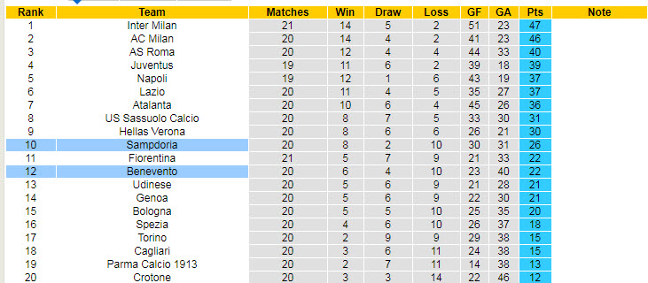 Tính tới thời điểm hiện tại, tân binh Benevento đang duy trì được thứ hạng tốt khi đứng ở vị trí thứ 12 trên BXH. Dẫu vậy, đây chưa phải thời điểm họ được phép chủ quan và nguy cơ xuống hạng là vẫn còn hiện hữu.