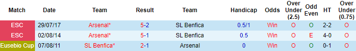 Arsenal toàn thắng cả 2 trận đối đầu Benfica gần đây với các tỷ số đậm 5-2 và 5-1. Tuy nhiên cả 2 trận đấu đó đều thuộc khuôn khổ giải giao hữu Emirartes Cup, Benfica cũng không tung ra đội hình mạnh nhất khi làm khách của Arsenal.