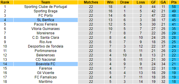 Với 21 điểm đang có trong tay, Boavista cũng chưa có sự an toàn. Họ chỉ còn hơn vị trí cầm đèn đỏ có 2 điểm, cách biệt hoàn toàn có thể bị vượt qua chỉ sau 1 vòng đấu. Thời gian qua, ít nhiều Boavista cũng có sự khởi sắc với 2 chiến thắng và 1 trận hòa ở 4 vòng gần nhất.