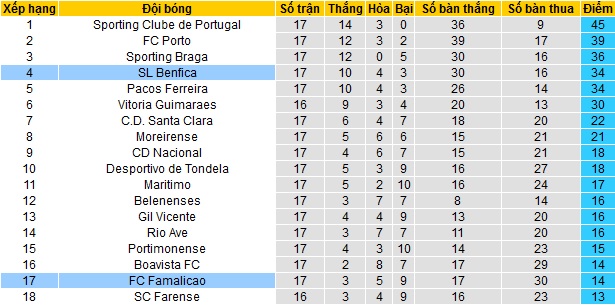 Bảng xếp hạng giải VĐQG Bồ Đào Nha trước vòng 18