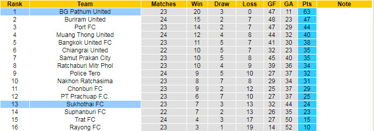 Trái ngược với hình ảnh chói sáng của Buriram United (đội bóng bất bại từ đầu mùa tới giờ), Sukhothai bước vào trận đấu tối nay với bộ mặt bạc nhược. Cụ thể, họ vừa thua tới 4 và chỉ hòa 1 ở 5 lượt trận mới đây. Kể từ đầu mùa tới giờ, Sukhothai chỉ đứng ở vị trí thứ 13 trong số 16 đội khi có được 24 điểm.