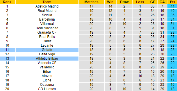 Phong độ và thống kê đối đầu Bilbao vs Getafe
