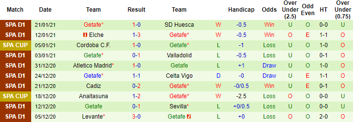 + Thống kê 10 trận gần nhất của Getafe
