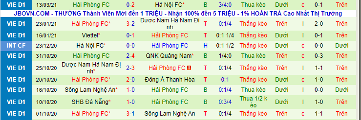 + Thống kê 10 trận gần nhất của Hải Phòng