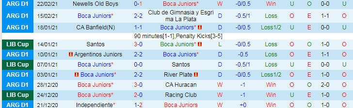 + Thống kê 10 trận gần nhất của Boca Juniors