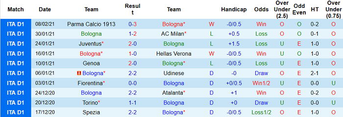 Bologna thời gian qua đã cải thiện được phần nào thành tích của mình tại Serie A. Họ thắng 2/4 vòng đấu vừa qua, giành 6 điểm. Thành tích này tốt hơn đáng kể so với quãng thời gian trước đó: chỉ thu về 5 điểm từ 8 vòng đấu.