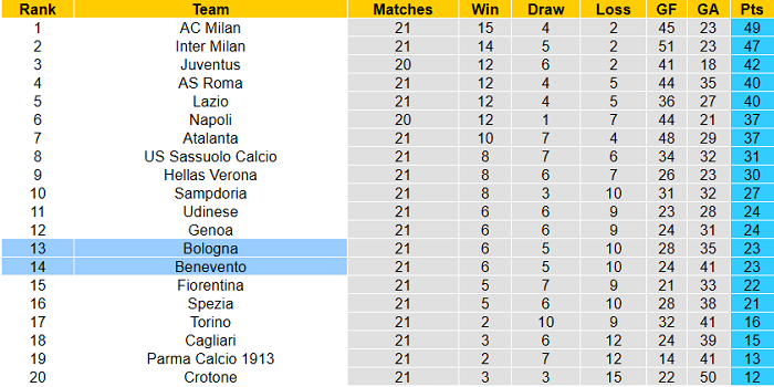 Chiến thắng mới đây với tỷ số 3-0 trước Parma giúp Bologna tạo ra khoảng cách tương đối an toàn với nhóm ‘cầm đèn đỏ’. Trước khi vòng 22 khởi tranh, Bologna đã hơn nhóm này 8 điểm.