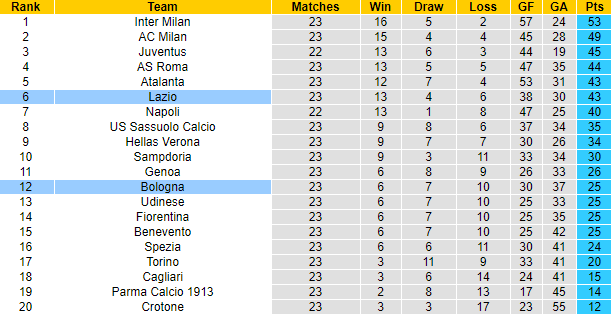 Thành tích của Lazio tại Serie A mùa này đang vượt trội so với Bologna. Theo đó, sau 23 vòng đấu Lazio đã giành được 43 điểm, xếp thứ 6 trên bảng xếp hạng. Trong khi đó Bologna mới giành được 25 điểm, xếp ở vị trí thứ 12. Hai trận đối đầu Bologna gần đây, Lazio toàn thắng.