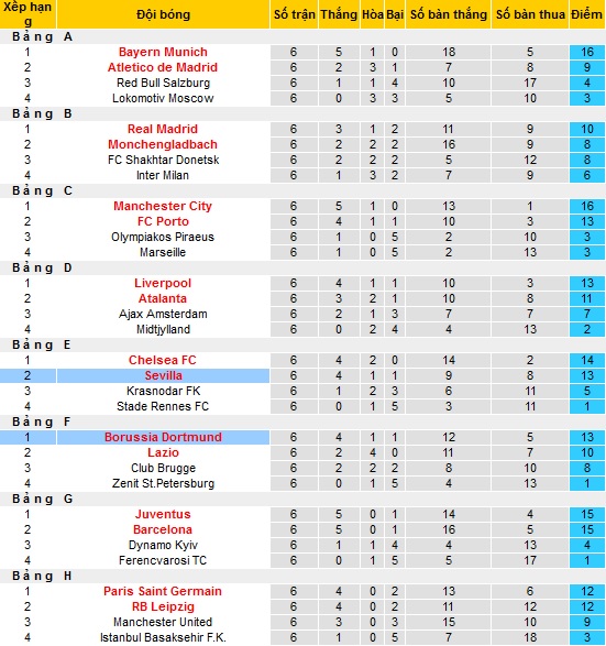 Xếp hạng vòng bảng cúp C1 châu Âu