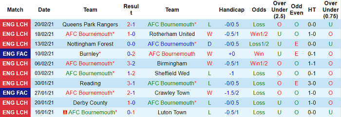 - Thống kê 10 trận gần nhất của Bournemouth