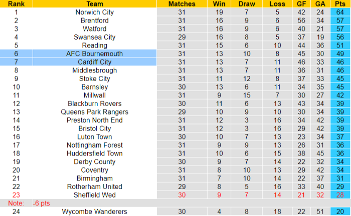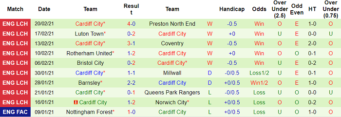 Cardiff là đội có thành tích tốt nhất Championship 2020/21 thời gian vừa qua. Họ toàn thắng 5 vòng đấu gần nhất, ghi tổng cộng 11 bàn thắng và chỉ nhận 3 bàn thua. Với 15 điểm tuyệt đối, Cardiff vươn lên vị trí thứ 7 sau vòng 31 và chỉ kém 3 điểm so với Top 6.