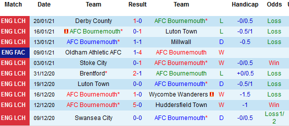 + Thống kê 10 trận gần nhất của Bournemouth