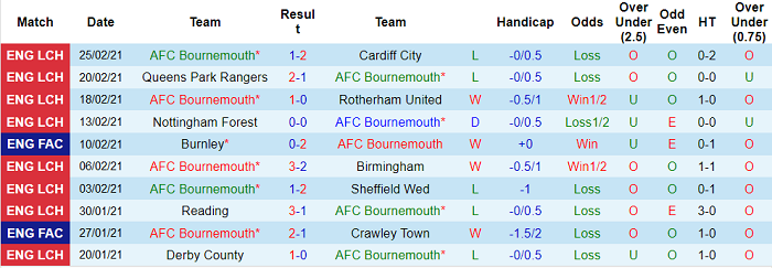 Sở dĩ Bournemouth chưa thể trở lại Top 6 bởi những kết quả không mấy tích cực trong thời gian gần đây. Họ toàn thua 2 vòng đấu vừa qua với cùng tỷ số 1-2 trước QPR và Cardiff. Quãng thời gian từ 16/1 tới 2/2, Bournemouth cũng trải qua 4 thất bại liên tiếp.