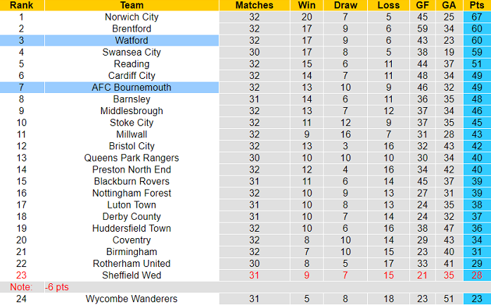 Bournemouth chỉ có được 49 điểm sau 32 vòng đấu và chưa thể ‘bon chen’ vào Top 6. Trong khi đó, Watford có 60 điểm và đang cạnh tranh suất thăng hạng trực tiếp với Norwich, Brentford và Swansea.