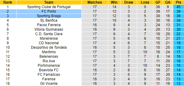 Bảng xếp hạng giải VĐQG Bồ Đào Nha 2020/21