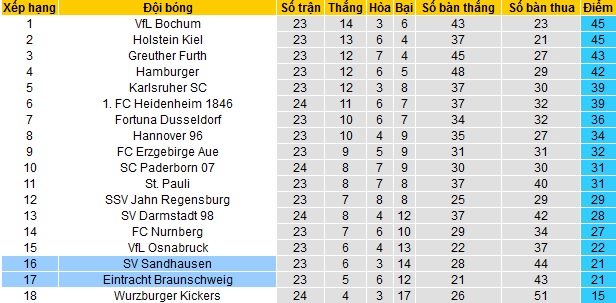 Trong khi Eintracht Braunschweig đang đứng áp chót bảng xếp hạng trong nhóm cầm đèn đỏ thì Sandhausen đứng ngay trên ở vị trí thứ 16, vị trí của đội phải đi đá play-off trụ hạng. Cả hai đội đều đang có cùng 21 điểm sau 23 vòng đấu nhưng Sandhausen đứng trên nhờ hơn về hiệu số bàn thắng (-16 so với -22).