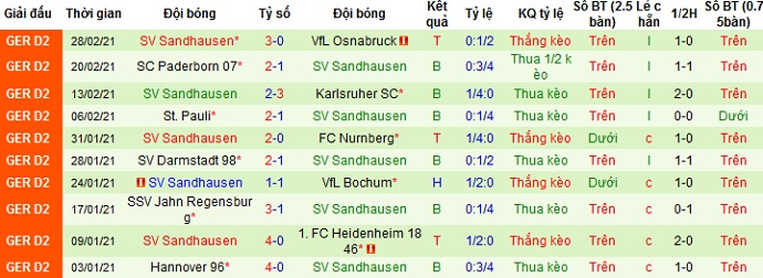 Với Sandhausen, đội bóng có được 2 trận thắng và để thua 3 trận trong 5 trận gần nhất. Thế nhưng thành tích sân khách của Sandhausen lại rất tệ khi đội bóng đã để thua cả 7 trận du đấu gần nhất.