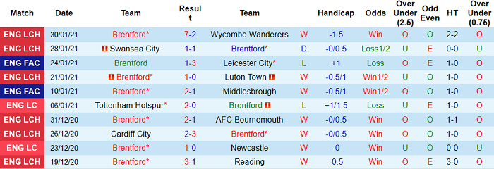 - Thống kê 10 trận gần nhất của Brentford