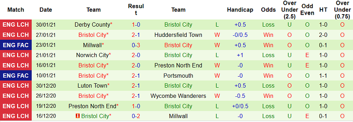 - Thống kê 10 trận gần nhất của Bristol