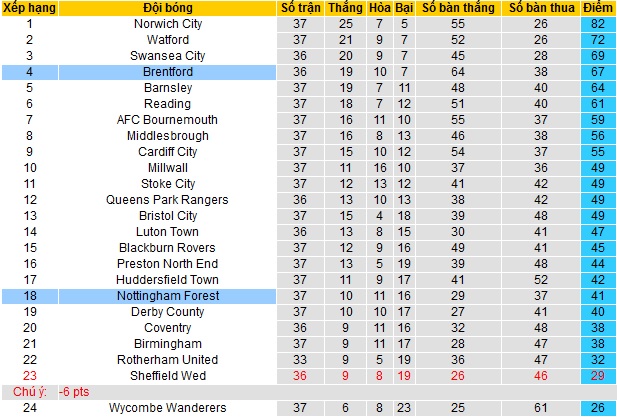 Trong khi đó Nottingham Forest chỉ đang đứng thứ 18 trên bảng xếp hạng với 41 điểm có được sau 37 vòng đấu. Tuy nhiên khoảng cách của đội bóng đến nhóm các đội cầm đèn đỏ hiện vẫn đang là 9 điểm nên mọi thứ vẫn chưa ở mức nguy cấp.
