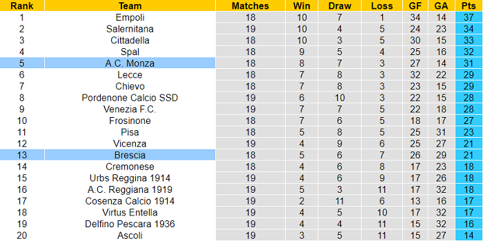 Brescia và Monza sở hữu thành tích tương đối khác nhau tại Serie B 2020/21. Brescia dù có thời gian dài ‘chinh chiến’ tại Serie A chỉ thu về 21 điểm sau 18 vòng đấu. Monza làm tốt hơn đáng kể với 31 điểm trong cùng khoảng thời gian.