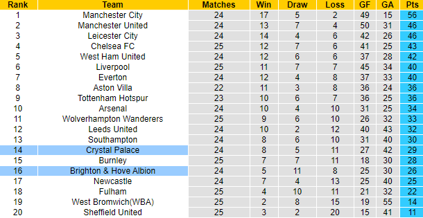 Sau 24 vòng đấu tại giải Ngoại hạng Anh mùa này, Brighton mới giành được 26 điểm, xếp thứ 16 trên bảng xếp hạng. Trong khi đó với số trận tương tự, Crystal Palace giành 29 điểm, xếp ở vị trí thứ 14. 3 trận đối đầu Brighton gần đây, Crystal Palace bất bại với 1 thắng, 2 hoà. Vì vậy việc Brighton chấp -3/4 theo kèo châu Á ở trận đấu sắp tới sớm cho thấy chủ nhà được giới chuyên môn tin tưởng.