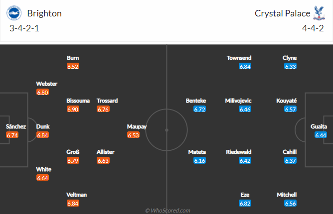 Brighton thể hiện phong độ khởi sắc giai đoạn gần đây. 6 vòng đấu vừa qua tại giải Ngoại hạng Anh họ đạt thành tích bất bại với 3 chiến thắng và 3 trận hoà. Ngược lại, Crystal Palace thể hiện sự sa sút rất rõ với 2 thất bại liên tiếp, thủng lưới 5 lần mà không ghi nổi 1 bàn danh dự. Đội hình khủng hoảng với 9 cầu thủ dính chấn thương, rất khó để Crystal Palace có thể thi đấu khởi sắc ở trận đấu sắp tới.