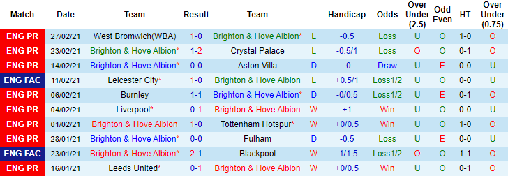 + Thống kê 10 trận gần nhất của Brighton