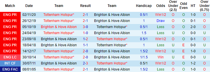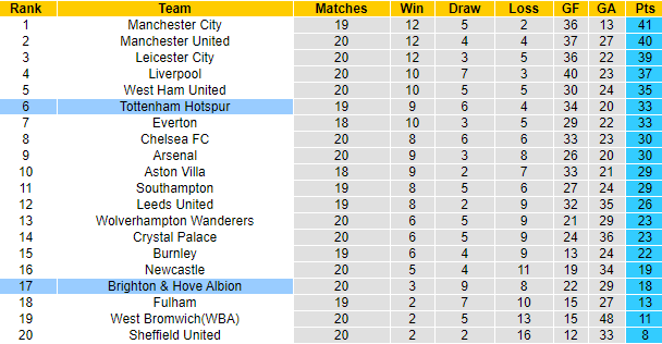 Brighton không phải đối thủ dễ bị bắt nạt với Tottenham. Hai trận đối đầu gần đây dù đều được chơi trên sân nhà, Spurs cũng phải rất vất vả mới có thể giành chiến thắng với tỷ số 2-1. Mùa giải trước khi làm khách của Brighton, Tottenham bị đánh bại với tỷ số 0-3.