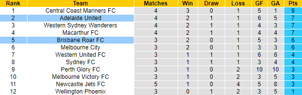 Brisbane Roar đang xếp thứ 5 trên bảng xếp hạng với 6 điểm nhưng họ lại đá ít hơn Adelaide 1 trận. Đáng chú ý, 2 trận gần đây Brisbane Roar toàn thắng dù phải thi đấu trên sân khách. Được thi đấu trên sân nhà, Brisbane Roar càng xứng đáng được tin tưởng vào khả năng giành điểm tối đa.