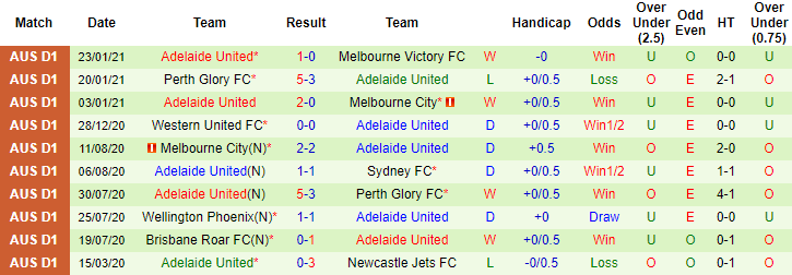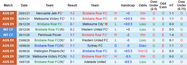 Adelaide giành chiến thắng 5 trận trong vòng 6 lần đối đầu Brisbane Roar gần đây trong khuôn khổ giải VĐQG Australia. Sau 4 vòng đấu tại A-League 2020/21, Adelaide giành 7 điểm, xếp ở vị trí thứ 2 trên bảng xếp hạng.