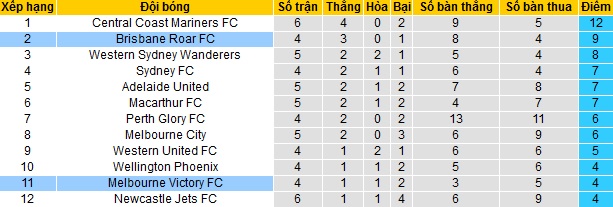 Bảng xếp hạng giải VĐQG Úc vòng 6
