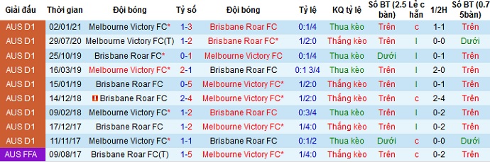 Tuy nhiên kèo chấp lại chỉ ở mức là -0,25. Lý do là vì trong cả 5 lần trước đó khi được thi đấu trên sân nhà, Brisbane Roar đều để thua trước Melbourne Victory! Ngoài ra trong cả 10 lần đối đầu gần nhất giữa hai đội thì có đến 8 lần chiến thắng thuộc về đội khách, chỉ một lần duy nhất chiến thắng thuộc về chủ nhà Melbourne Victory.