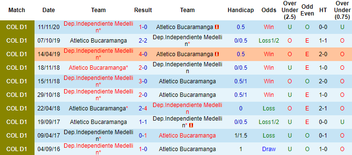 Bucaramanga lép vế trong các cuộc đối đầu Independiente Medellin trong quá khứ. Theo đó, trong vòng 18 lần chạm trán Bucaramanga trước đây, Independiente Medellin bất bại 14 lần với 11 chiến thắng và 3 trận hòa.