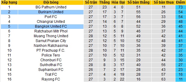 Bảng xếp hạng giải VĐQG Thái Lan vòng 28