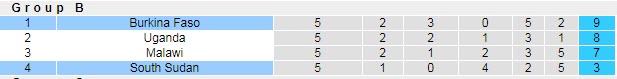 Tuy nhiên, do Uganda và Malawi gặp nhau ở lượt trận cuối cùng bảng B, Burkina Faso sớm có vé đi tiếp vào vòng chung kết, bất chấp kết quả của trận đối đầu với Nam Sudan.