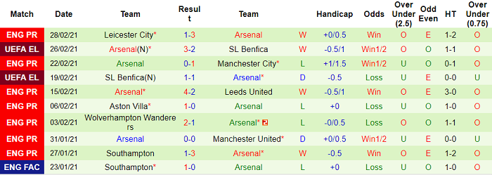 - Thống kê 10 trận gần nhất của Arsenal